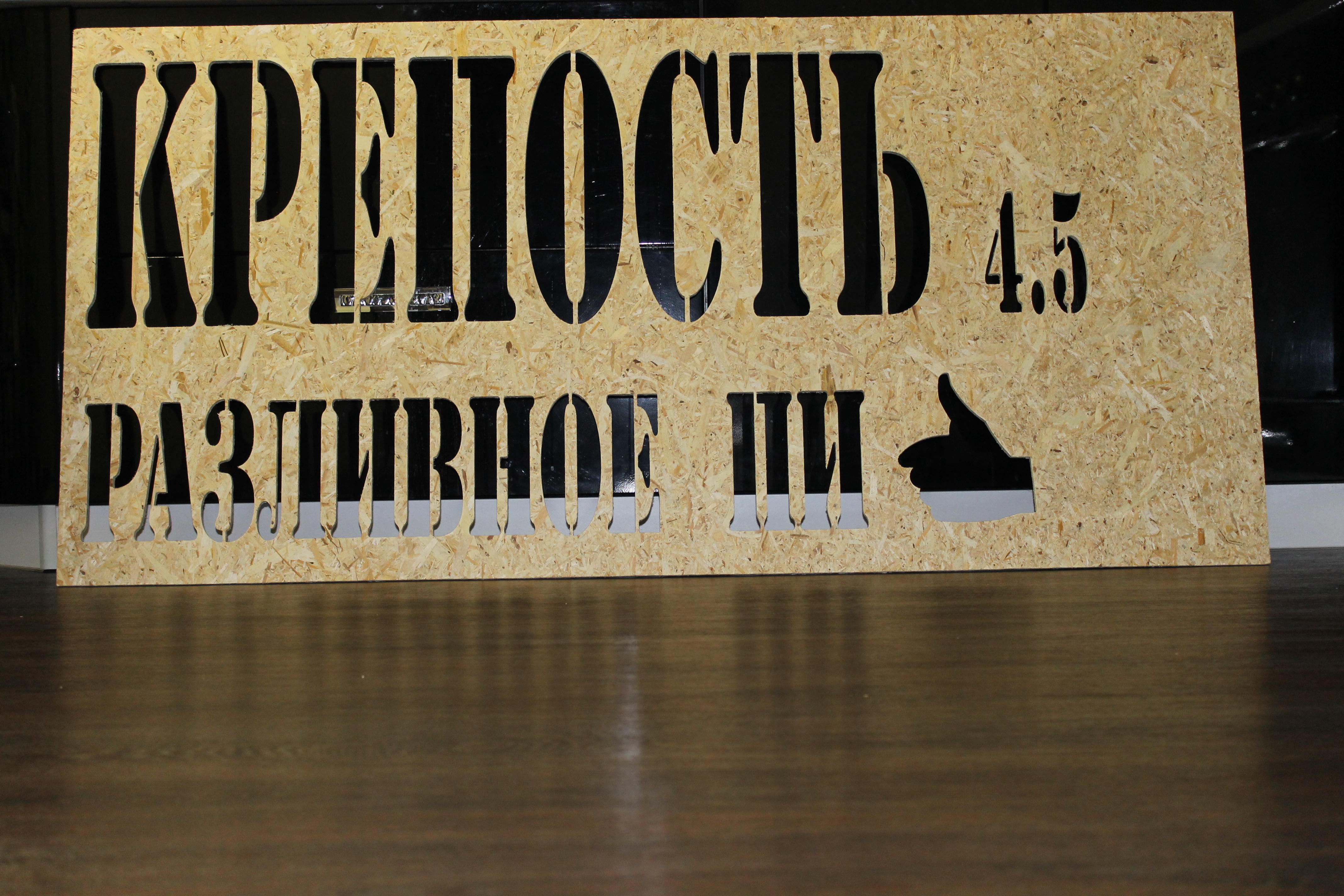 Размер надписи 1460мм на 900мм,на станке с рабочем полем 1300 на 1300мм смещением заготовкм по контрольным отверстиям ,сделанным программно станком в заготовке и столе.