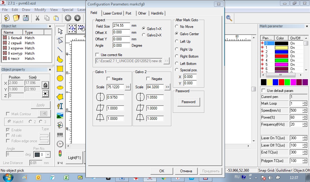 Фокусное расстояние определялось методом изменения высоты головки по максимуму нанесения гравировки черного цвета рисунка (квадрата). Высота до линзы составила 398 mm.