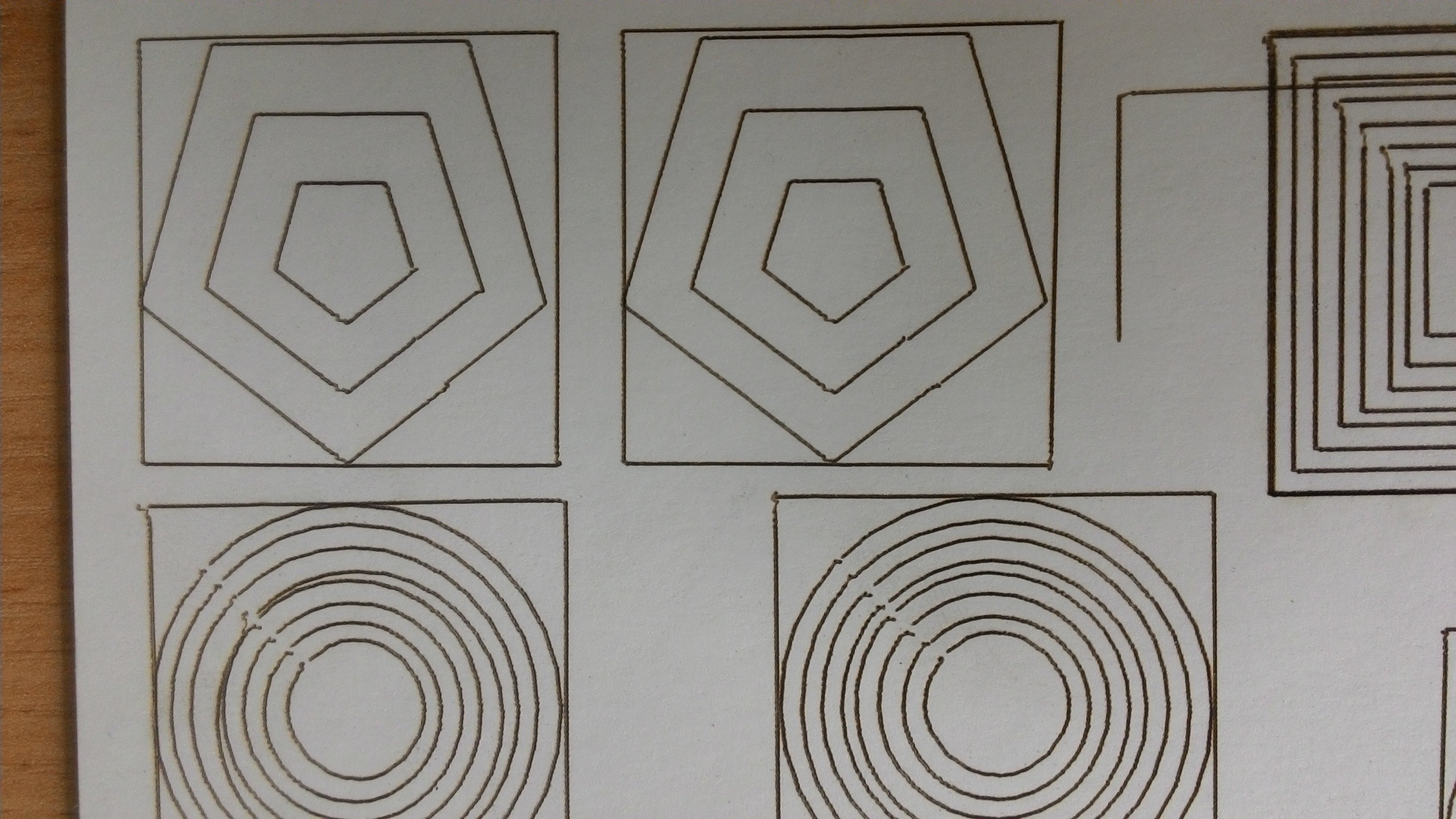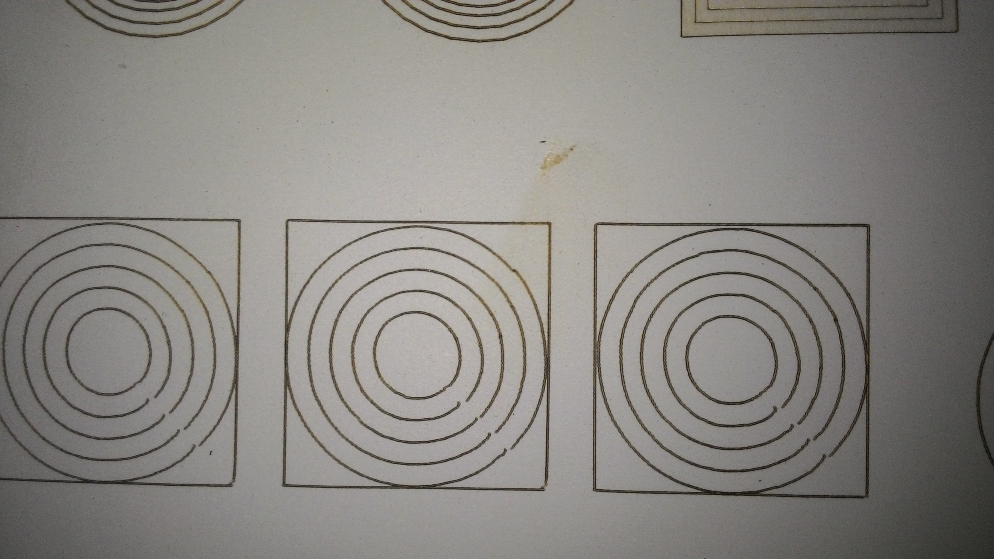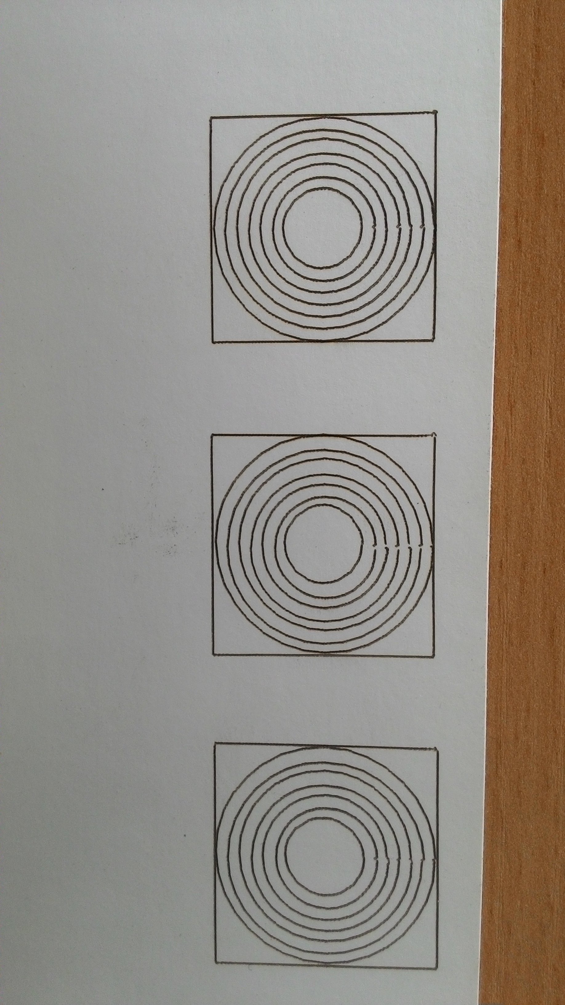первый образец резал нормально, я бы не придрался, но знающие люди сказали - ФУ..... (его нет на фото и на видео), но дальше пошло...не попадание в кругу и как предполагаю вибрации ( мало опыта резки на лазере, в основном только широкоформатное печатное) .