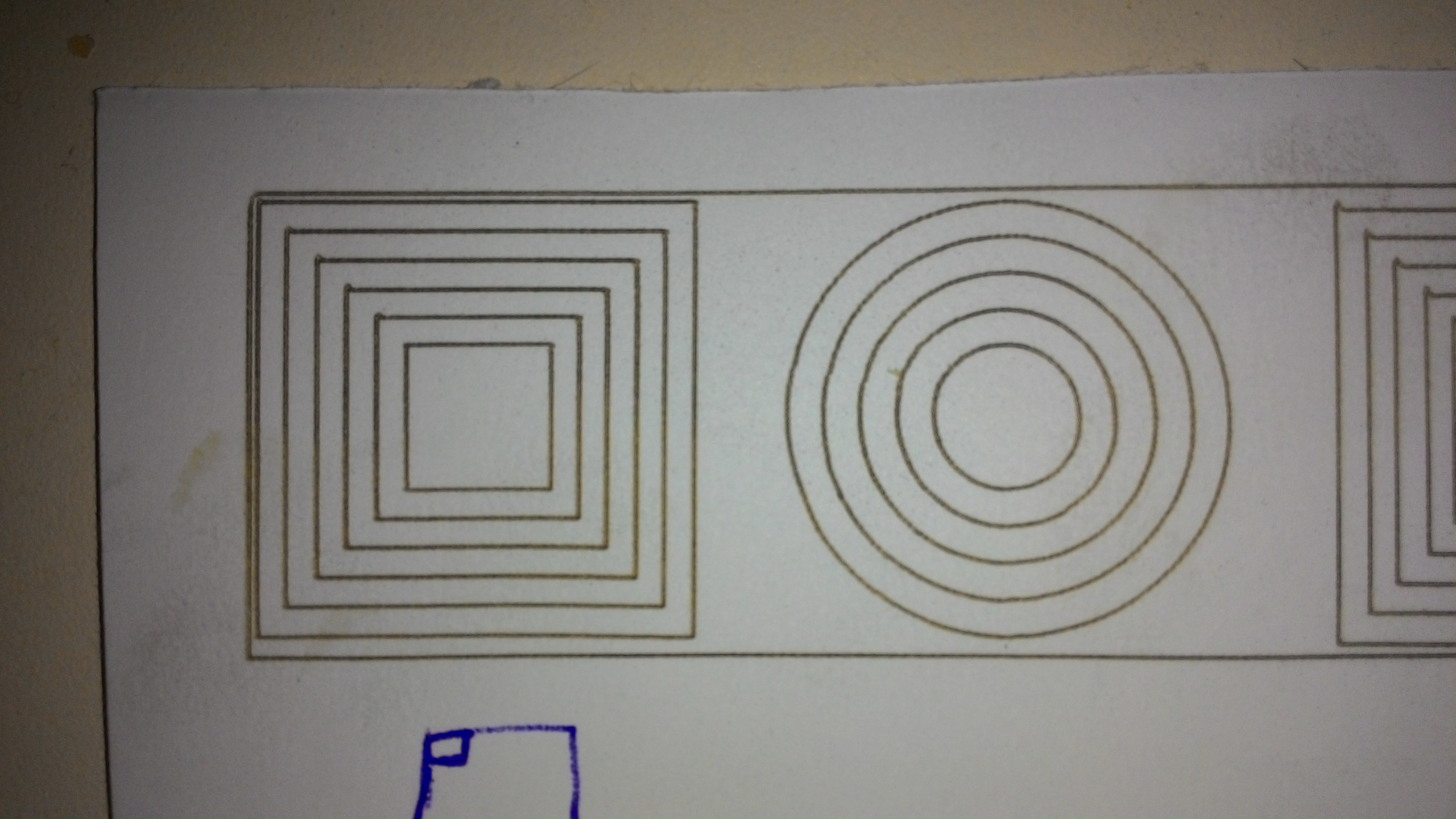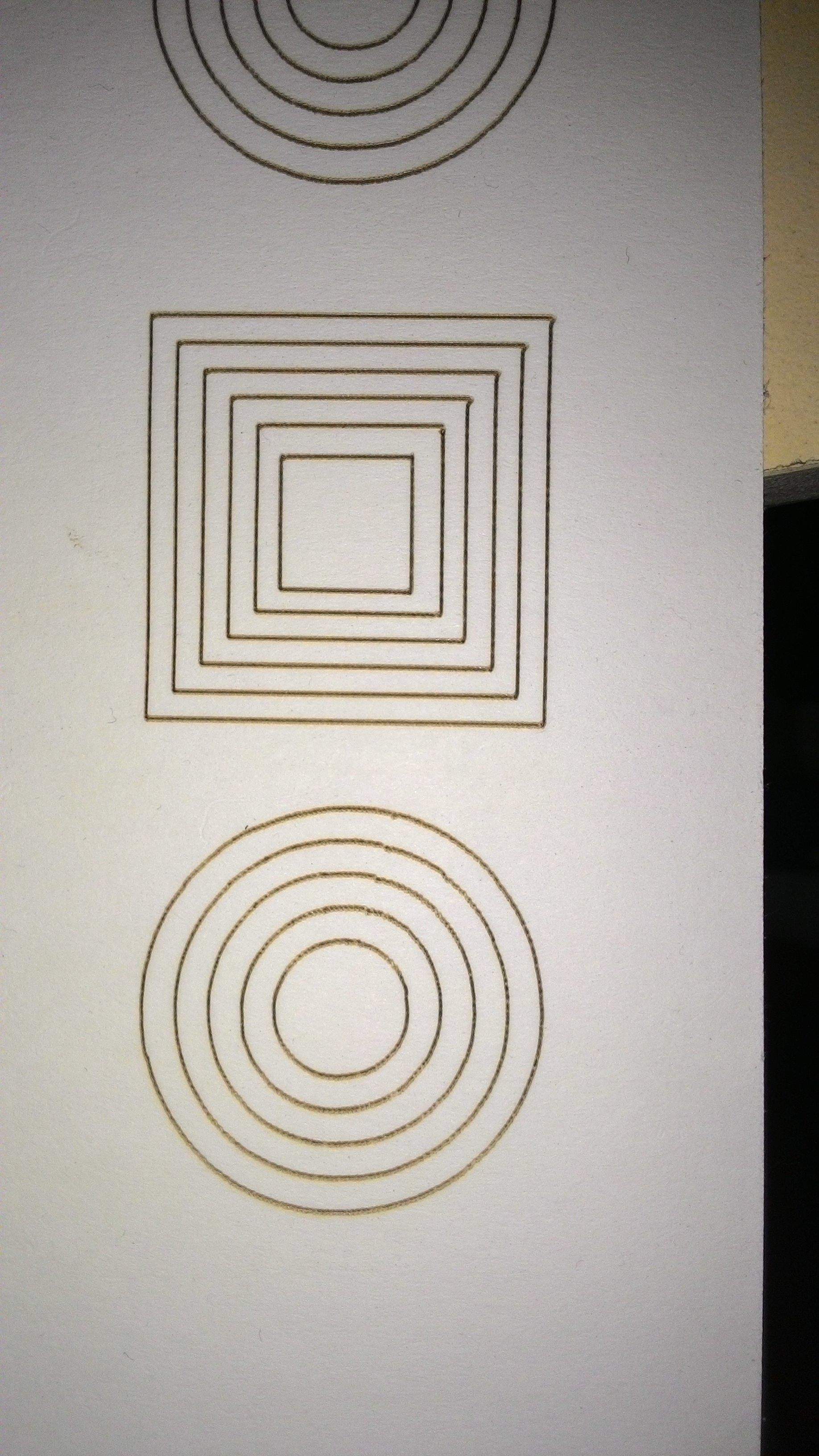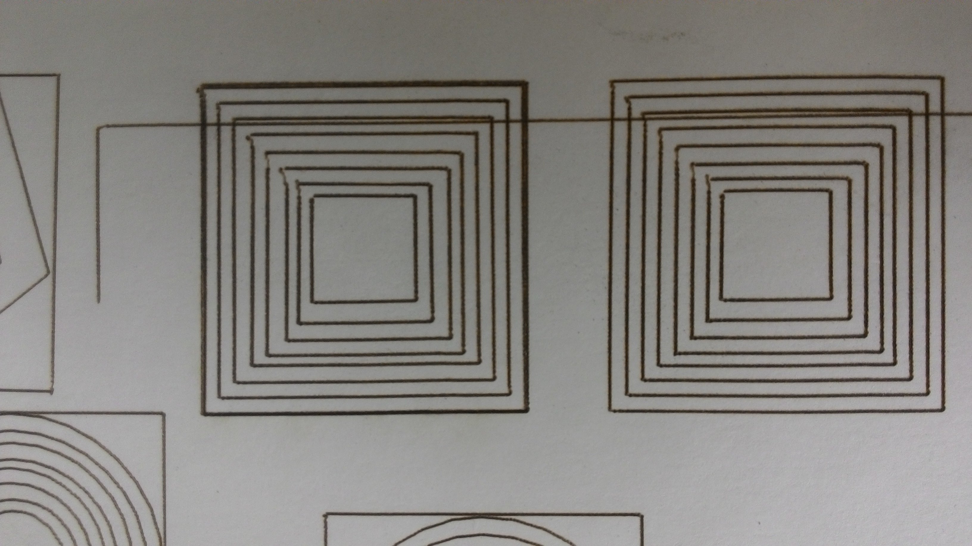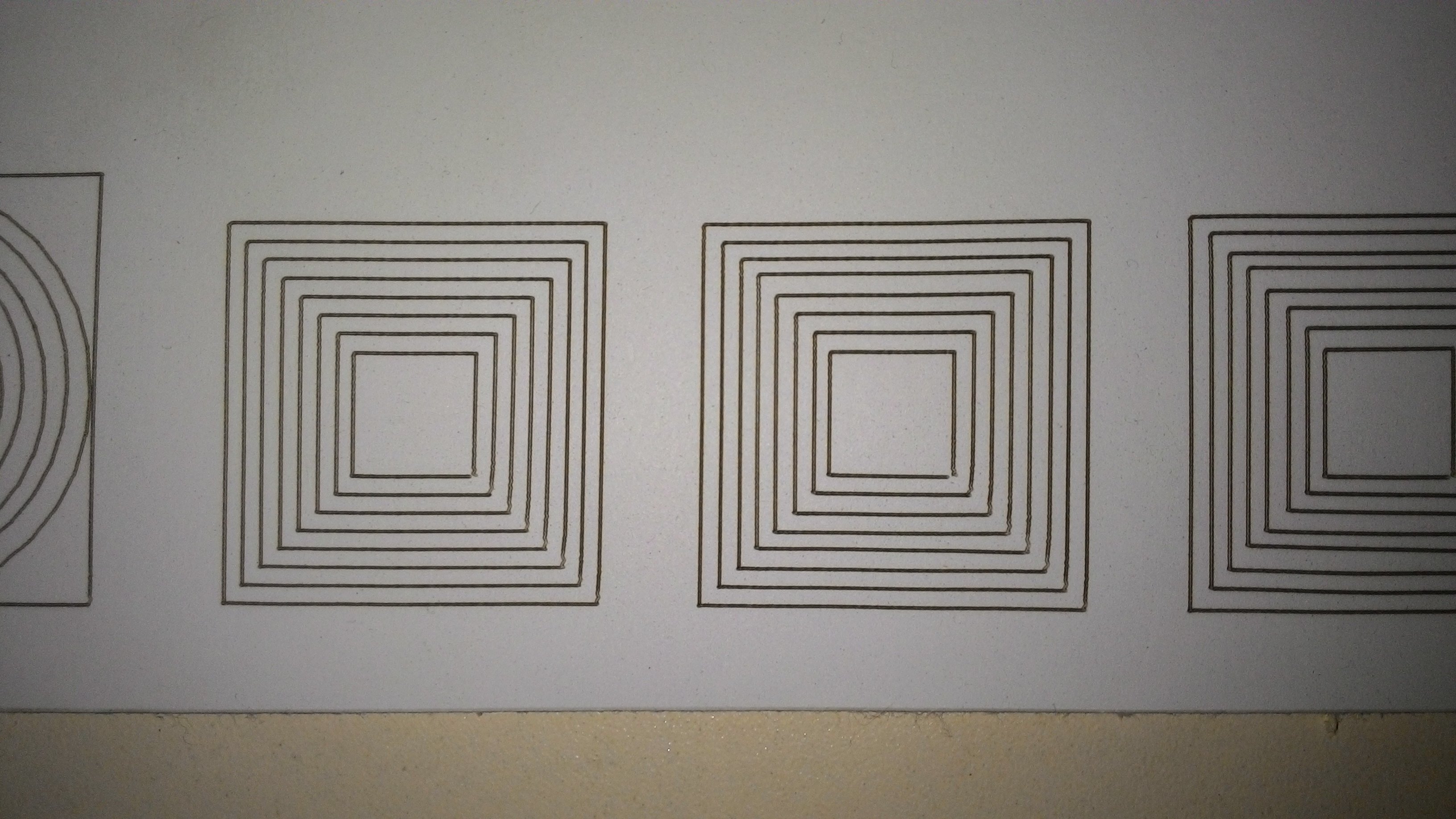 первый образец резал нормально, я бы не придрался, но знающие люди сказали - ФУ..... (его нет на фото и на видео), но дальше пошло...не попадание в кругу и как предполагаю вибрации ( мало опыта резки на лазере, в основном только широкоформатное печатное) .
