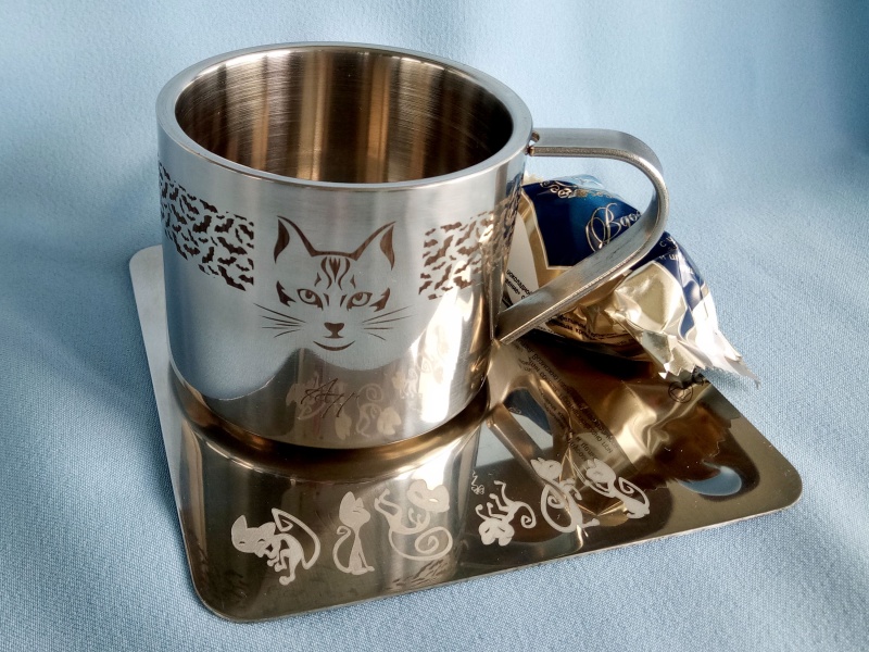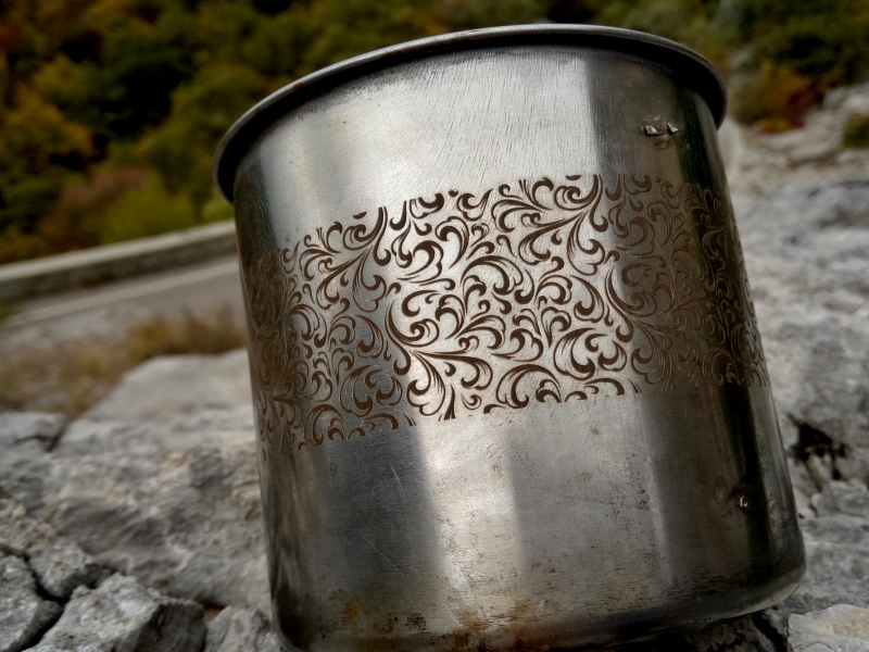 Для себя подвел черту, сделав вроде всё для борьбы с плагином "вектор по цилиндру". Залез в корпус и поменял значения в драйвере с 5000 до 12800, выставил 12800 в параметрах программы. разбивка 0,015 мм, Хатч то же 0,015 мм причем однонаправленный, при оптимизированном двунаправленном почему-то были глюки типа часть обьекта проходит без вращения! Крутит медленно, получается неплохо см. старую кружку с узором. При больших заливках на алюминиевой кружке см. фото немного видна сливающаяся полосатость. Вроде проблемы решены, но осадочек остался - работая таким макаром с векторами не выйдет запустить очистку, как я делал на пробном золотом кольце - наружный текст гравировался основным проходом и ещё двумя под 45 и -45 очистка.