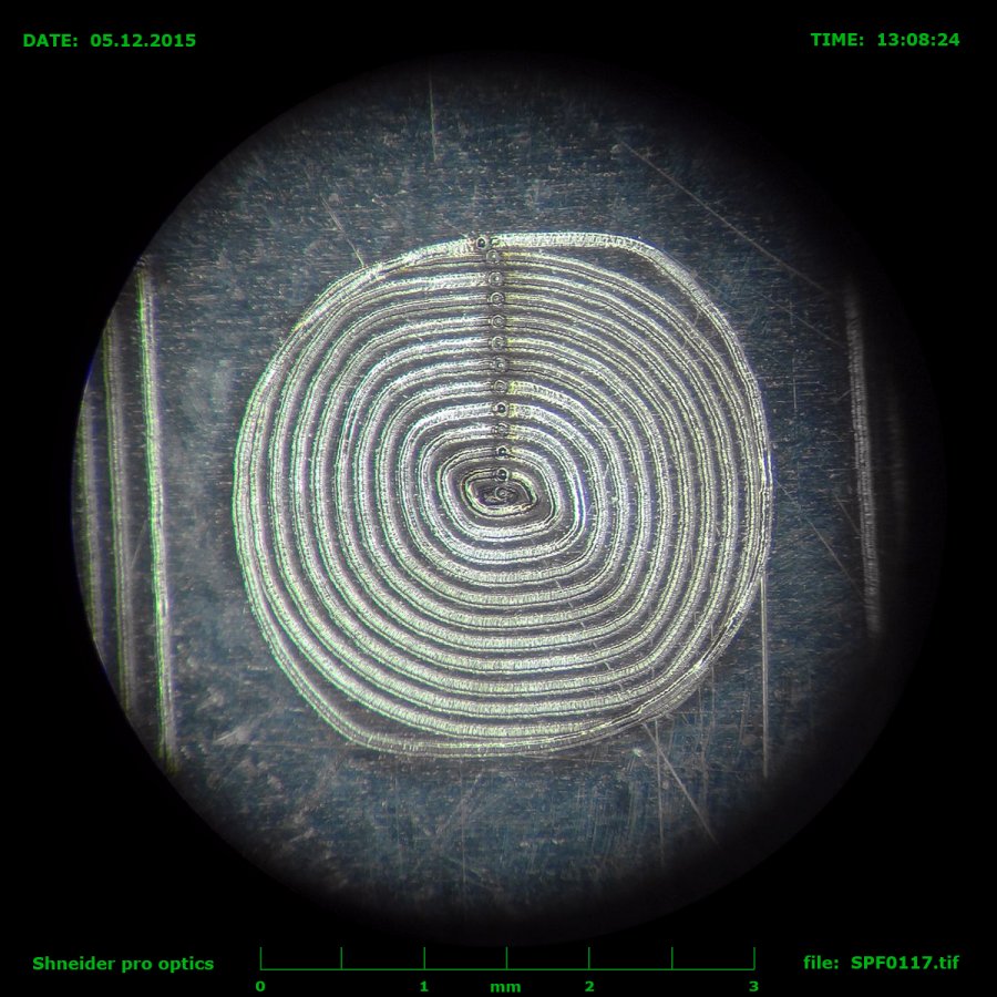 2. F-theta линза: качество стекла, герметичность конструкции, сама конструкция головки(количество элементов, сборка, расстояние и т.п.), ну и длина перетяжки(зависит от фокусного главным образом и рассходимости, но линза может внести свои коррективы). Все это влияет главным образом на размер и качество пятна в области обработки.