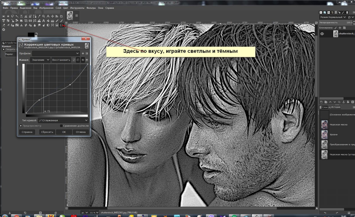 Фотографии готовлю в GIMP чем выше качество начальной фотографии тем лучше, хотя от нас это не зависит - что принёс клиент из этого материала исходим. Вставил скриншоты. Надеюсь пояснил понятно, никаких секретов в этом нет. Фотошоп принципиально не использую.Насколько я понимаю, граждан интересуют параметры гравировки фотографии. А именно они тут и не показаны.