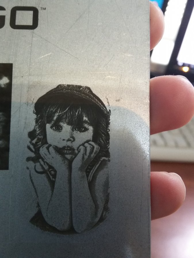 В программе у вас получается два слоя - первый штриховка делает поверхность из блестящей матовой, что бы потом не было бликов и отражений от зеркальной поверхности (ко всему ещё зеркальная поверхность визуально делает пустые места как бы чёрными) мощность 10%, скорость 1000, частота 60 Hz, после этого нажимаете кнопку применить. Для того чтобы слои не путались делаю слои разными цветами .поясните пожалуйста как в режиме заливки вы гравируете растр