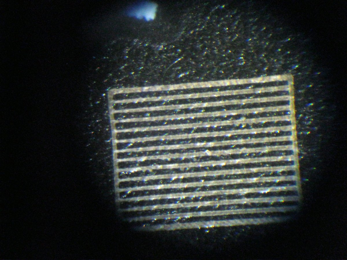 2. Маркировка немного "сыпется". Сама по себе - нет, но если "пошкрябать" ногтём, то да. Причём полностью её не содрать, но товарный вид и контрастность теряются. Я даже не знаю, как должно быть в идеале. Может она и не должна держаться полностью? Или должна? Единственный пример маркировки от другой конторы у нас в городе (Минск, РБ), который я видел, нанесён с помощью какого-то твердотельника, под микроскопом выглядит более неряшливой (хотя и более яркая и контрастная) и тоже подвержена сцарапыванию. Попробовал акриловый лак поверху. Помогает. После полимеризации лака поверхность становится более устойчивой. Но правильно ли это? Что-то мне подсказывает, что лаки не нужны и маркировка лазером не должна так откровенно сцарапываться.