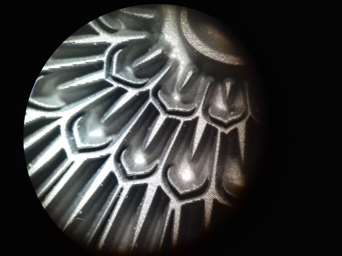 , но опасения оказались напрасными, этот магниевый сплав под лазером испаряется, не вспыхивает. Лазер работал в двух режимах - выборка и очистка. См. файлы. Делал 20 проходов по 5 циклов, из опытов понял, что если дать все 20 проходов сразу, то идет как бы постепенное затухание процесса. Заливка по 0,02 мм, выборка и очистка идут под углом 90 гр. и при каждом проходе автоматический поворот на 10 гр. Процесс для моего клише длился минут 15 и дал глубину около 0,63мм.