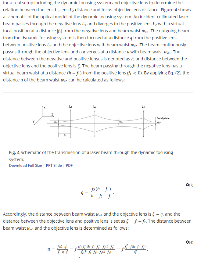 Речь изначально не была о динамической оси Z, это 1, 2 - не на этом принципе (изменения входной апертуры на зеркалах скан головы) построено устройство. Как вариант почитать вложение, все операции сводятся к фокусным расстояниям линз и расстояниям между ними, которое - "фокусное расстояние зависит от радиусов кривизны поверхностей, показателей преломления оптических материалов и толщин элементов системы." и не зависит от иных параметров (М2, D и пр.)принципе изменения входной апертуры на зеркалах скан головы и построена работа систем с динамической фокусировкой