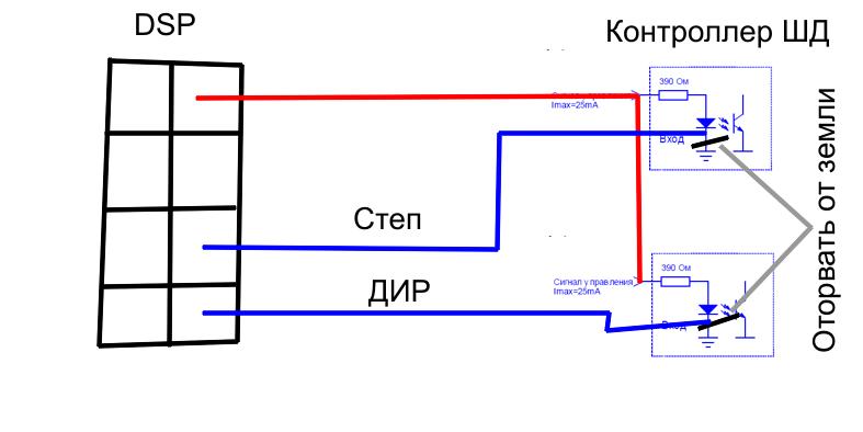 К проблеме подключился автор контроллера (благо живем в одном городе). Сложилось подозрение, что дело в том, что нужен инвертированный сигнал step, а идет обычный. Попытались взять с DSP-платы сигналы step- и dir- с соответствующих клемм разъемов.