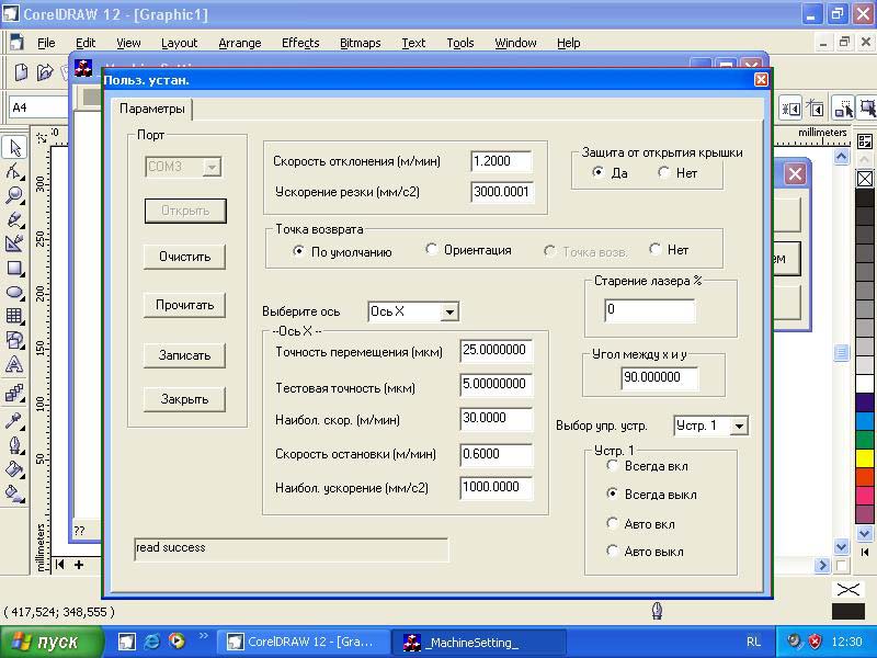 А логика настройки станка странная. Первым делом выскакивает панелька заводских настроек (пустая), но ее судя по инструкции трогать нельзя. Но в пользовательских настройках я даже не могу инвертировать ось. Выходит, надо лезть в заводские. Прилагаю скриншоты тех настроек, с какими резал.