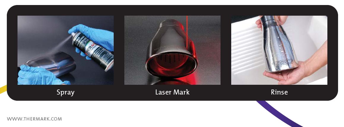 "Гравировка с применением специальной пасты или спрея на основе молибдена. Паста разводится спиртом или обыкновенной водой до консистенции зубной пасты, затем, равномерным слоем наносится на область гравировки. После взаимодействия с лазерным лучом, паста впекается в металл, изделие моется обычной водой, изображение имеет черный цвет."